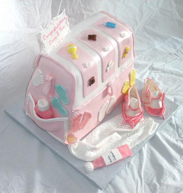 Baby Diaper Bag Cake For Baby Shower With Edible Gumpaste Baby Shoes, Baby Blanket, Baby Decorations Top Angle