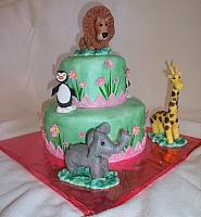 Zoo Animals Child Birthday Cake with Pink Flowers And Grass Side Design