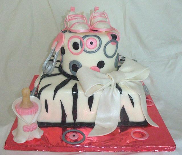 Whimsical Pink, Grey, Black, and White Zebra Striped Baby Shower Cake main view