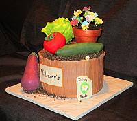 Jim Vollmer ordered this garden theme cake for his father's family who owned a farm. The family sold vegetables and flowers from their farm. The eggplant, tomato, lettuce, cucumber, and terra cotta pot are all fondant covered rice krispy treats. The cake is a 3 layer 10 inch round chocolate cake and vanilla cake filled with fresh raspberries and raspberry buttercream. The cake sits on a 16 by 16 inch cake board and the gumpaste pansies top out for a total height of 14 inches.