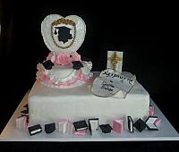 Stephanie M. ordered this cake for her daughter's Gananda high school graduation celebration. The two layer vanilla and red velvet 12 inch by 18 inch cake had a single layer 8 inch round cake on top. The miniature books, graduation caps, pink roses, diploma, caduceus symbol and heart shaped plaque cake decorations are all custom made edible gumpaste.
