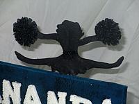 Stephanie M. ordered this sports theme graduation cake for her daughter's graduation Gananda celebration. The two layer vanilla and chocolate cake 12 inch by 18 inch cake had a 8 inch single layer cake on top. The cheerleaders, Gananda banner, Panther mascot, and graduation silhouettes on cake sides are edible gumpaste.