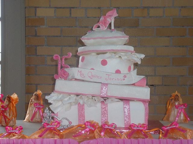 Quinceanera Cake in Pink and White with Stacked Presents, Edible Fashion Shoe, Pillow, and Princess Crown front view