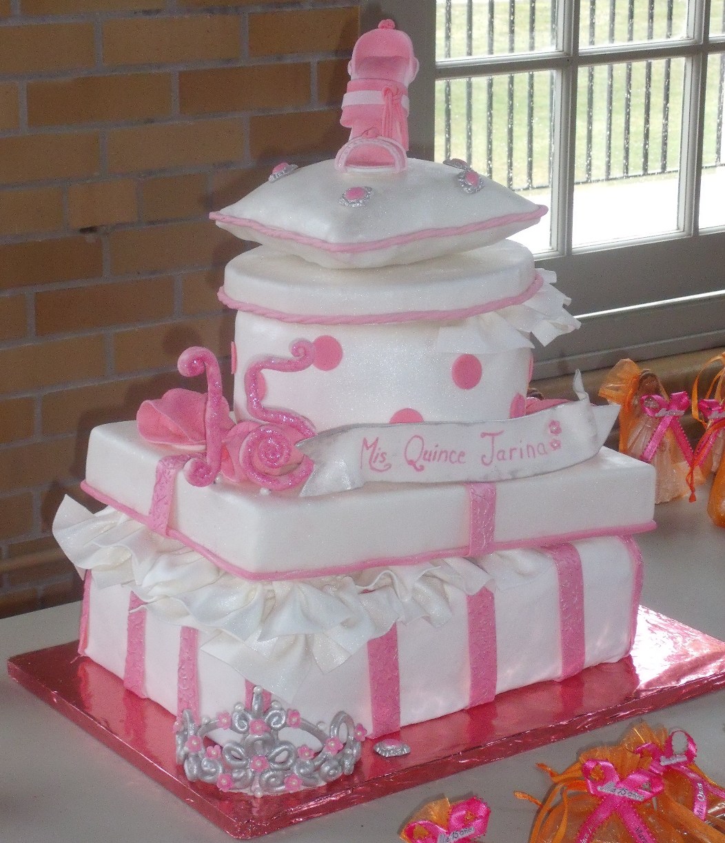 Quinceanera Cake in Pink and White with Stacked Presents, Edible Fashion Shoe, Pillow, and Princess Crown main view