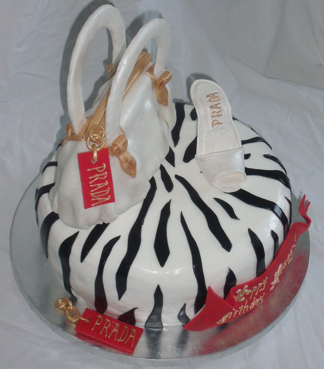 Red and White Purse, Shoe, Black Zebra Striped Cake top view