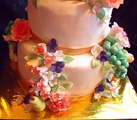 Donna D. ordered this fruit and floral tiered cake for her mother's birthday celebration and 60 of her friends. The bottom tier is 11 inch round, middle tier 8 inch round, top tier 6 inch round. The cake flavors were carrot cake, red velvet, and vanilla. All decorations are edible.