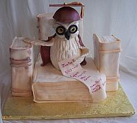 Robyn and John Young ordered this cake for their son Justin Young's high graduation party. The owl is really rice krispy treats underneath and will keep as a memento for 30 years in a china cabinet or wherever it is not exposed to humidity and direct sunlight. the books are all cake underneath the fondant. The colors are maroon and gold. The owl is holding a list of Justin's important accomplishments.